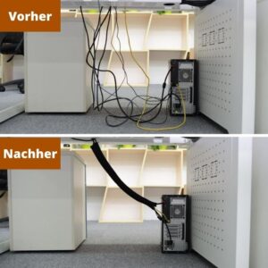 Verworrene, offen liegende Kabel sind nicht schön anzusehen und zudem ein Sicherheitsrisiko, insbesondere wenn im Home Office nach Feierabend auch Haustiere oder Kinder Zugang zu den Räumlichkeiten haben. Kabelschläuche helfen dabei, Monitorkabel, USB-Kabel und Ladekabel ästhetisch ansprechend und zudem sicher zu verstauen.